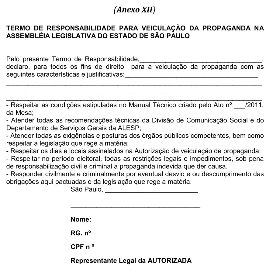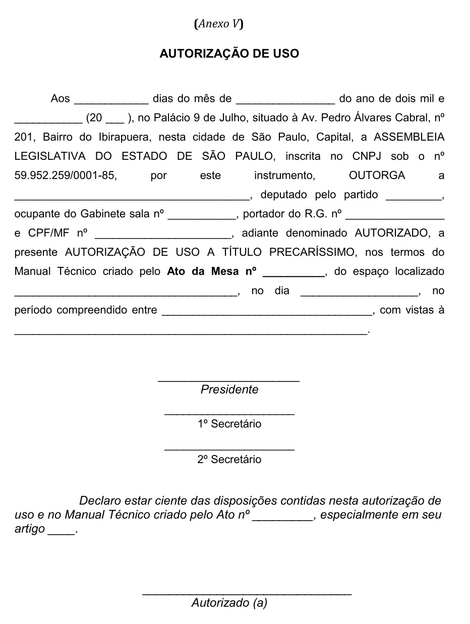 Artigo 6º - O parlamentar requerente deverá anexar ao formulário a Autorização de Uso (Anexo V), de cujo conteúdo deverá ter tomado conhecimento, expressando-o por meio da aposição de seu “ciente”.