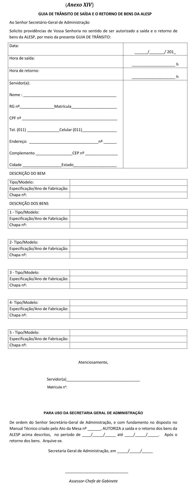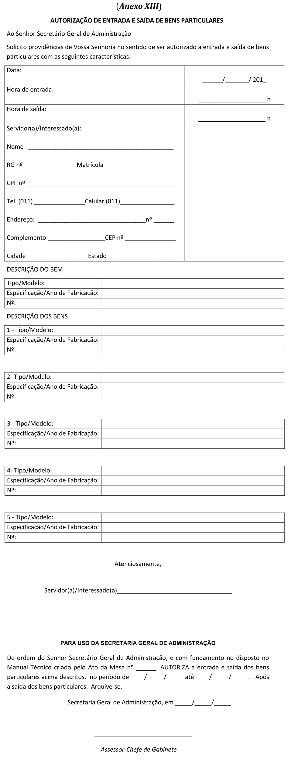 Artigo 70 - O Controle de acesso/saída de bens, equipamentos, materiais e afins, somente terão acesso/saída mediante a prévia autorização a ser expedida pela Secretaria Geral de Administração, por requerimento próprio disponibilizado na administração ou por meio eletrônico via intranet da ALESP (Anexo XIII).