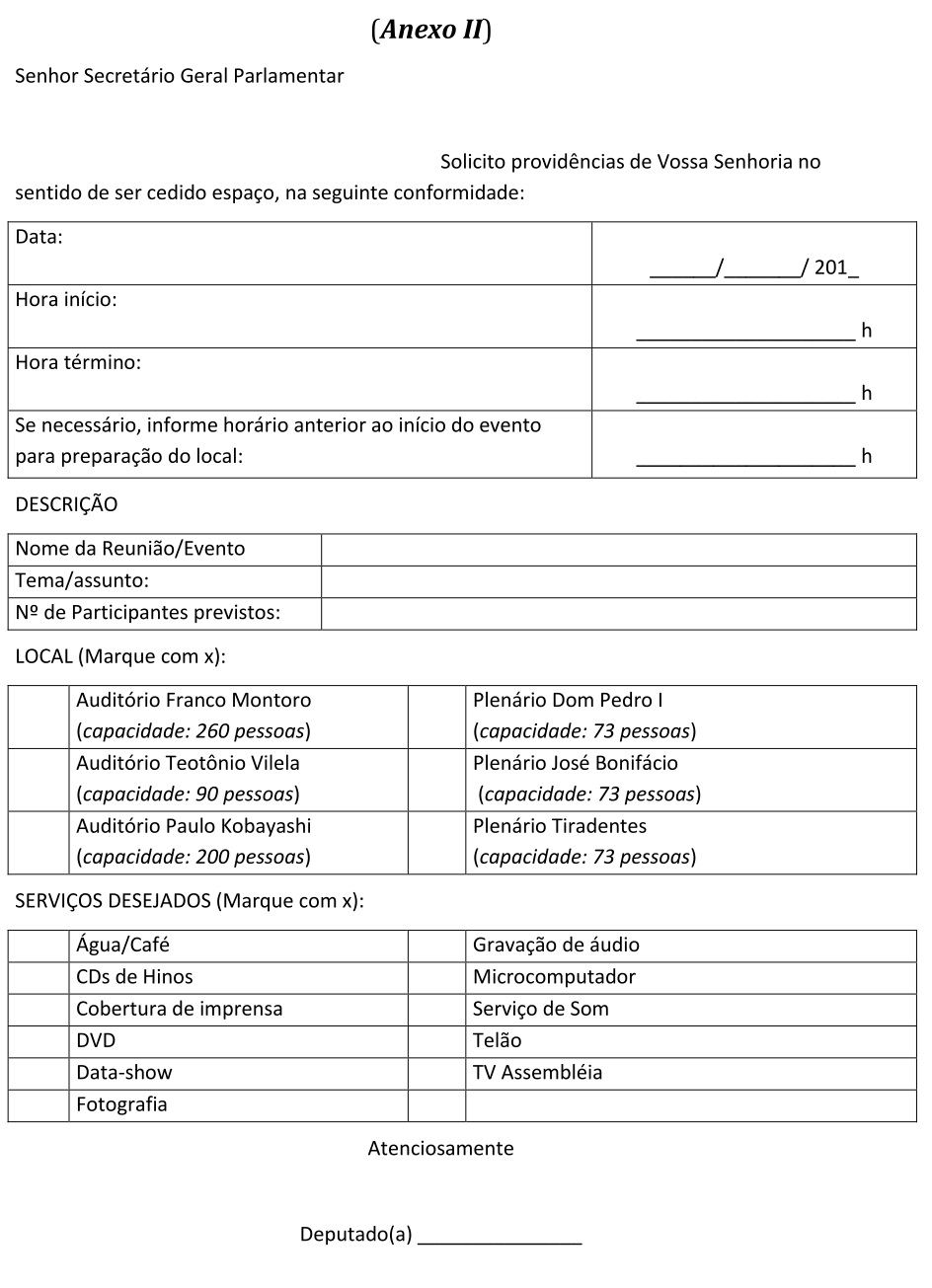 Artigo 3º - As solicitações de cessão de uso dos Plenários, bem como dos Auditórios: Franco Montoro, Teotônio Vilela e Paulo Kobayashi, deverão ser apresentadas por Parlamentar em formulário próprio (Anexo II), com antecedência mínima de 5(cinco) dias da data marcada para a realização do evento e serão dirigidas ao Secretário Geral Parlamentar, devendo dar entrada no Departamento de Comissões, sendo necessário um pré-agendamento junto àquele Departamento.