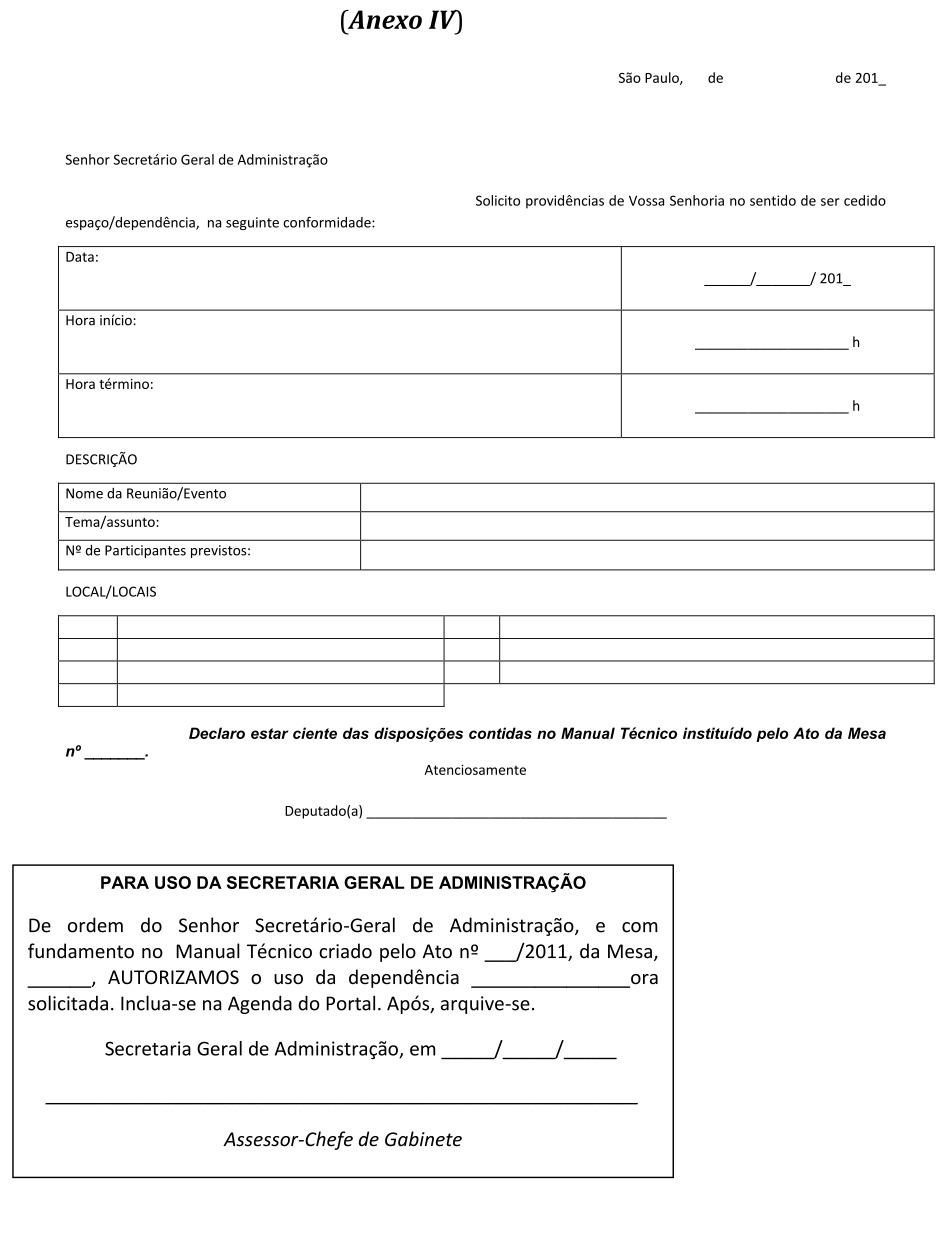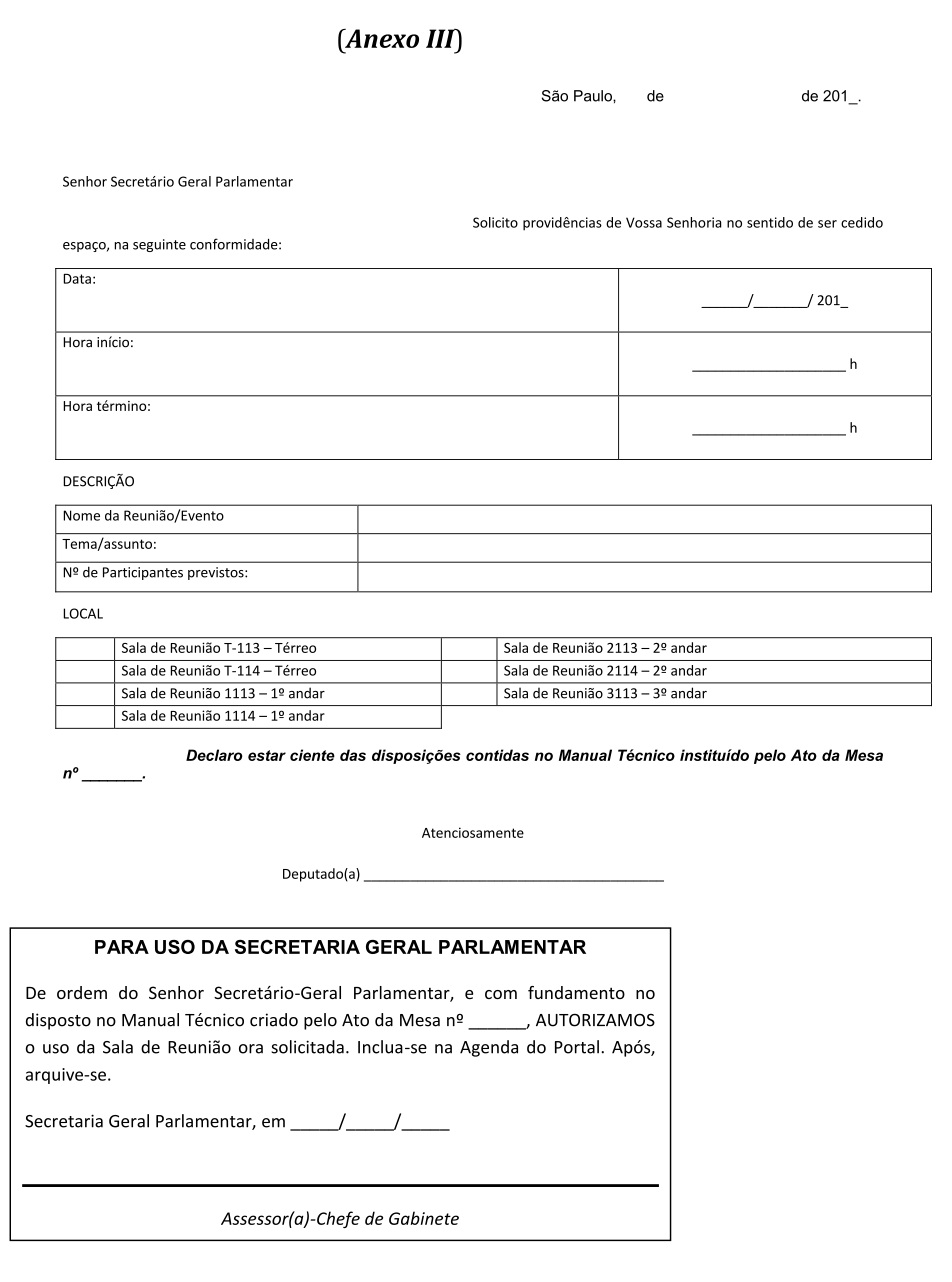 Artigo 4º - As solicitações de cessão de uso das Salas de Reunião do Prédio Anexo serão dirigidas, por meio de formulário próprio (Anexo III), ao Secretário Geral Parlamentar, e os interessados deverão dar entrada, preferencialmente, com 2 (dois) dias de antecedência, no expediente da Secretaria Geral Parlamentar, sendo necessário um pré-agendamento junto àquela Secretaria.