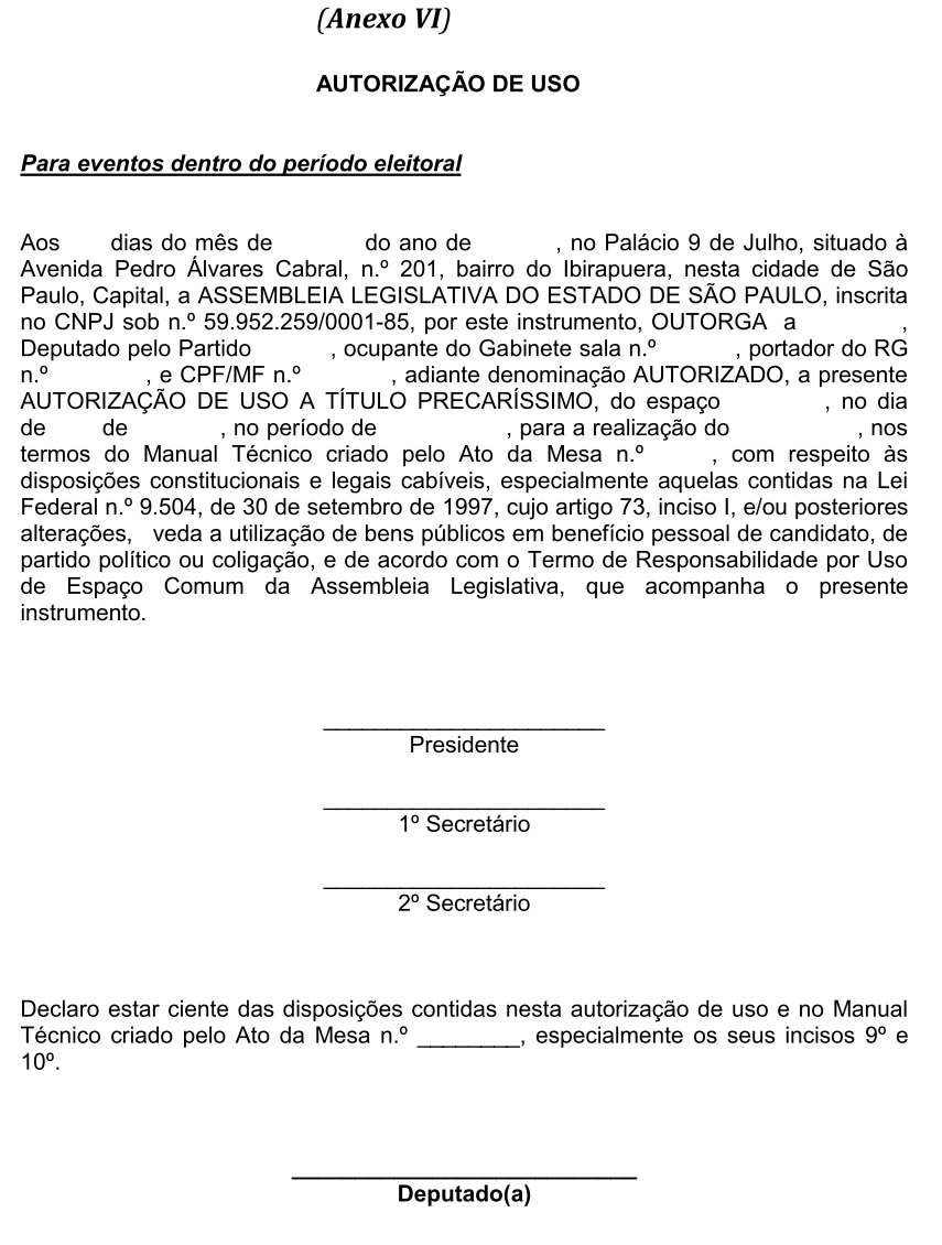 Artigo 11 - A concessão da autorização de cessão de espaço em período eleitoral se dará mediante a lavratura dos competentes termos de Autorização de Uso e de Responsabilidade, conforme (Anexos VI e VII).