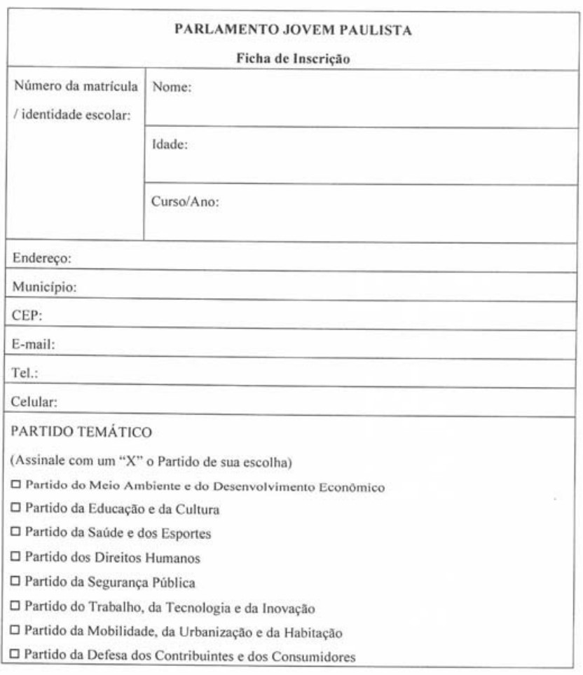 1) Os candidatos a deputado do Parlamento Jovem Paulista deverão inscrever-se em suas escolas, nos prazos estabelecidos no "Cronograma de Atividades", em ficha própria (Anexo l).
