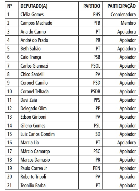 O Presidente da Assembleia Legislativa do Estado de São Paulo, no uso de suas atribuições regimentais e observado o Ofício Nº 09/2015 - SP, de 26 de maio de 2015, da Deputada Clélia Gomes, bem como os Termos de Adesão, nomeia as Deputadas e os Deputados relacionados abaixo para compor a Frente Parlamentar do Respeito e da Liberdade à Diversidade Humana.