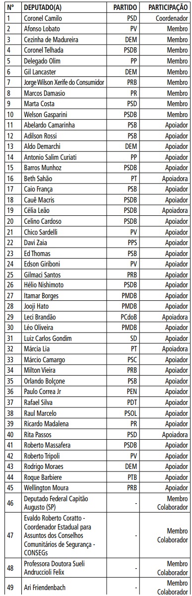 O Presidente da Assembleia Legislativa do Estado de São Paulo, no uso de suas atribuições regimentais e observado o Ofício s/nº, entregue à Mesa em 19 de março de 2015, do Deputado Coronel Camilo, bem como os Termos de Adesão, nomeia as Deputadas e os Deputados relacionados abaixo para compor a Frente Parlamentar de Segurança.