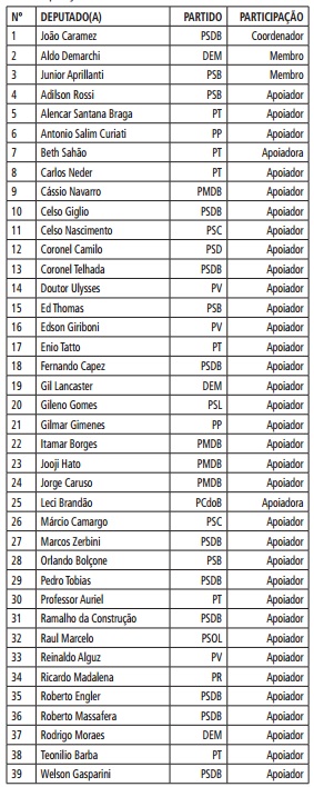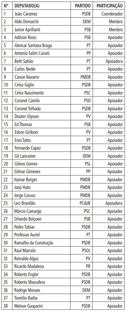 O Presidente da Assembleia Legislativa do Estado de São Paulo, no uso de suas atribuições regimentais e observado o Ofício Ofício s/nº, entregue à Mesa em 4 de maio de 2017, do Deputado João Caramez, bem como os Termos de Adesão, nomeia as Deputadas e os Deputados relacionados abaixo para compor a Frente Parlamentar de Apoio ao Desenvolvimento do Gás Natural no Estado de São Paulo.