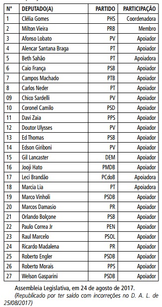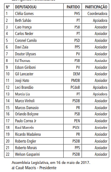 O Presidente da Assembleia Legislativa do Estado de São Paulo, no uso de suas atribuições regimentais e observado o Ofício Nº 122/2017 - SP,entregue à Mesa em 9 de maio de 2017, da Deputada Clélia Gomes, bem como os Termos de Adesão, nomeia as Deputadas e os Deputados relacionados abaixo para compor a Frente Parlamentar em Defesa dos Agentes Penitenciários.