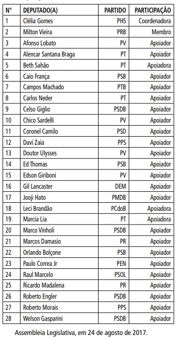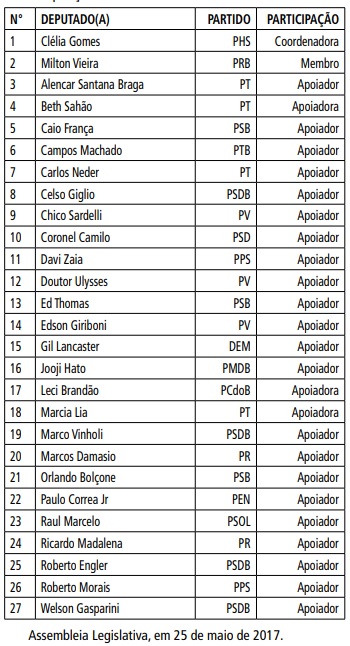 2) Ofício Nº 160/2017- SP, entregue à Mesa em 23 de maio 2017, da Deputada Clélia Gomes - inclusão do Deputado Milton Vieira como Membro e dos Deputados Alencar Santana Braga, Campos Machado, Celso Giglio e Chico Sardelli como Apoiadores.