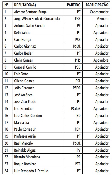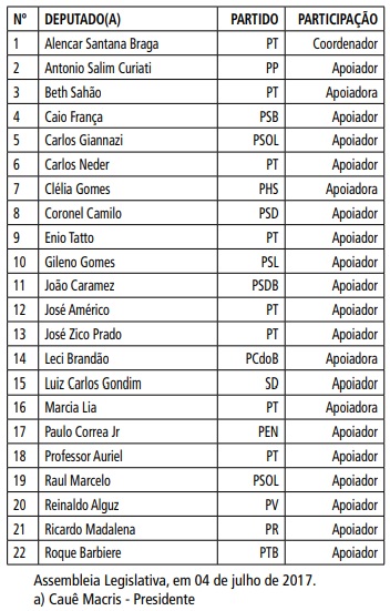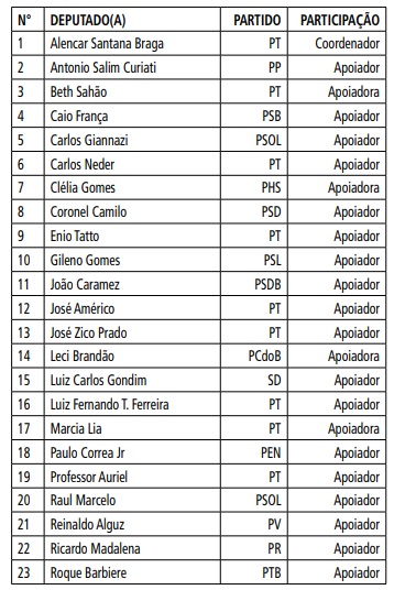 O Presidente da Assembleia Legislativa do Estado de São Paulo, no uso de suas atribuições regimentais e observado o Ofício ASB nº 38/2017, do Deputado Alencar Santana Braga, bem como os Termos de Adesão, nomeia as Deputadas e os Deputados relacionados abaixo para compor a Frente Parlamentar pela Modernização da Linha 7 - Rubi da CPTM.