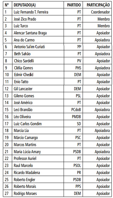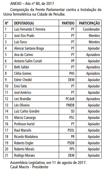 O Presidente da Assembleia Legislativa do Estado de São Paulo, no uso de suas atribuições regimentais e observado o Ofício LFTF 166/2017, do Deputado Luiz Fernando T. Ferreira, bem como os Termos de Adesão, nomeia as Deputadas e os Deputados relacionados abaixo para compor a Frente Parlamentar contra a Instalação da Usina Termelétrica na Cidade de Peruíbe.