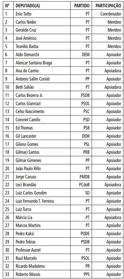 O Presidente da Assembleia Legislativa do Estado de São Paulo, no uso de suas atribuições regimentais e observado o Ofício nº 86/2018, entregue à Mesa em 2 de março de 2018, do Deputado Enio Tatto, bem como os Termos de Adesão, nomeia as Deputadas e os Deputados relacionados abaixo para compor a Frente Parlamentar "Trem Varginha Já".