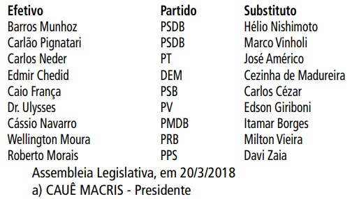 O Presidente da Assembleia Legislativa do Estado de São Paulo, no uso de suas atribuições regimentais e observado o disposto no Ato nº 02, de 06 de fevereiro de 2018, que criou a Comissão Parlamentar de Inquérito composta por 9 (nove) membros titulares e igual número de suplentes para, no prazo de 120 (cento e vinte) dias, “apurar denúncias de irregularidades nos contratos celebrados com Organizações Sociais da Saúde - OS’s, pelas Prefeituras e pelo Governo do Estado de São Paulo”, conforme o Requerimento nº 2928, de 2017, de autoria do Deputado Edmir Chedid, CONSTITUI a referida Comissão, nomeando os seguintes membros efetivos e substitutos: