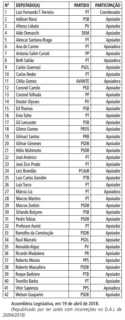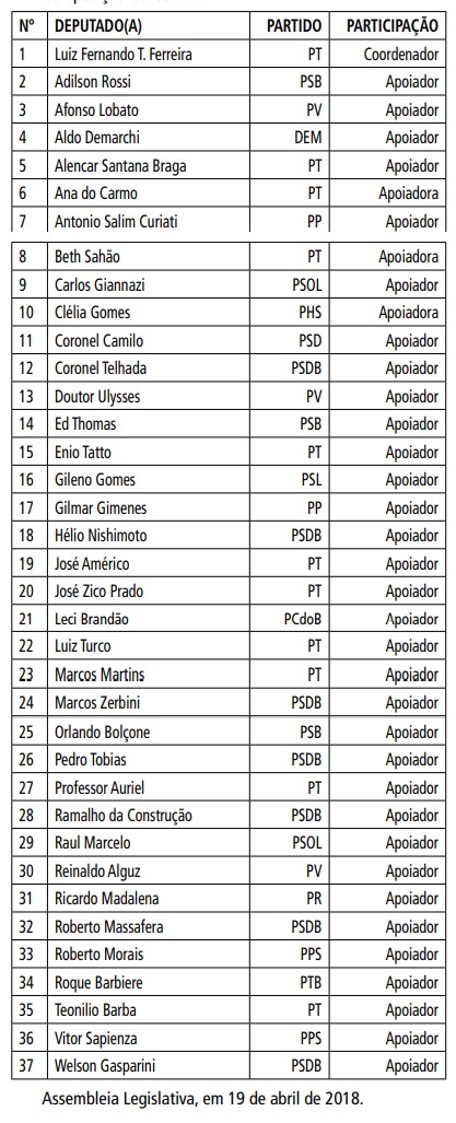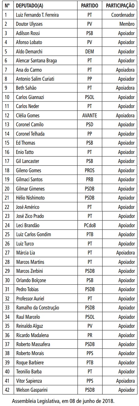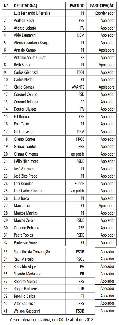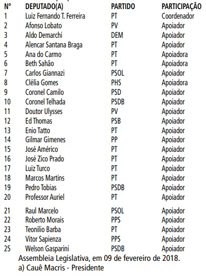 2) Ofício LFTF 015/2018, do Deputado Luiz Fernando T. Ferreira, entregue à Mesa em 20 de fevereiro de 2018 - inclusão da Deputada Leci Brandão e dos Deputados Adilson Rossi, Antonio Salim Curiati, Gileno Gomes, Hélio Nishimoto, Marcos Zerbini, Orlando Bolçone, Ramalho da Construção, Reinaldo Alguz, Ricardo Madalena e Roque Barbiere como Apoiadores;