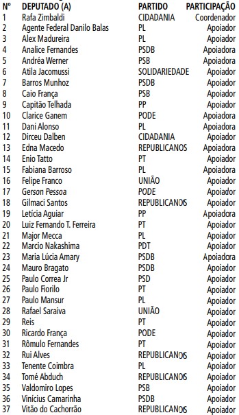 O Presidente da Assembleia Legislativa do Estado de São Paulo, no uso de suas atribuições regimentais e observado a inicial do Processo Alesp Sem Papel Nº 10426, Frente Parlamentar Nº 100, entregue à Mesa em 20/04/2023, do Deputado Rafa Zimbaldi, bem como os Termos de Adesão, nomeia as Deputadas e os Deputados relacionados abaixo para compor a Frente Parlamentar de Combate e Enfrentamento às Drogas.