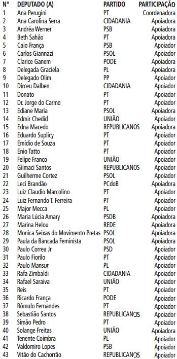 O Presidente da Assembleia Legislativa do Estado de São Paulo, no uso de suas atribuições regimentais e observado a inicial do Processo Alesp Sem Papel Nº 10435, Frente Parlamentar Nº 109, entregue à Mesa em 20/04/2023, da Deputada Ana Perugini, bem como os Termos de Adesão, nomeia as Deputadas e os Deputados relacionados abaixo para compor a Frente Parlamentar Sistema CROSS/SUS.