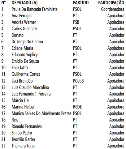 O Presidente da Assembleia Legislativa do Estado de São Paulo, no uso de suas atribuições regimentais e observado a inicial do Processo Alesp Sem Papel Nº 9638, Frente Parlamentar Nº 110, entregue à Mesa em 26/04/2023, da Deputada Paula Da Bancada Feminista, bem como os Termos de Adesão, nomeia as Deputadas e os Deputados relacionados abaixo para compor a Frente Parlamentar para a Promoção de Igualdade Racial e em Defesa dos Povos indígenas e Tradicionais.