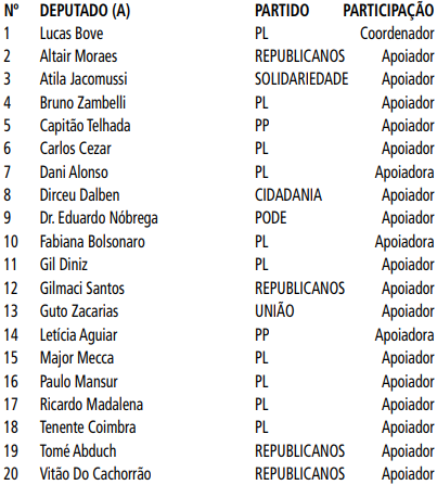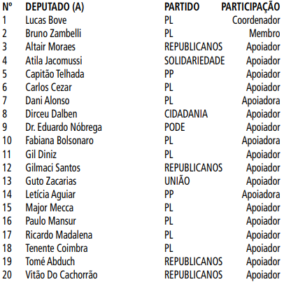 2) Ofício Legislativo n° 791, de 2023, entregue à Mesa em 29/11/2023, do Deputado Bruno Zambelli, com ciência do coordenador, Deputado Lucas Bove - alteração da participação do Deputado Bruno Zambelli de apoiador para membro.