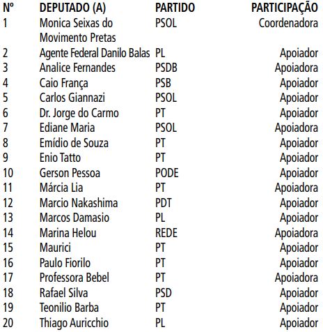 O Presidente da Assembleia Legislativa do Estado de São Paulo, no uso de suas atribuições regimentais e observado a inicial do Processo Alesp Sem Papel N° 8625, Frente Parlamentar N° 65, entregue à Mesa em 24/03/2023, da Deputada Monica Seixas do Movimento Pretas, bem como os Termos de Adesão, nomeia as Deputadas e os Deputados relacionados abaixo para compor a Frente Parlamentar de Combate ao Racismo.
