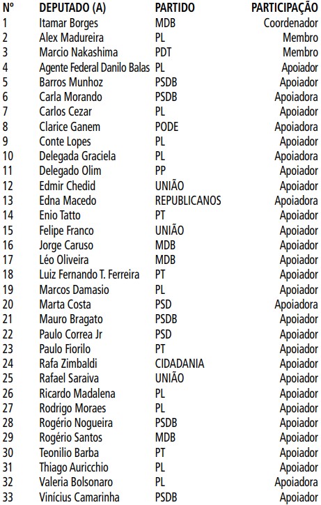 3) Exclusão da Deputada Valéria Bolsonaro em razão do afastamento do mandato parlamentar a partir de 10 de abril de 2024, por ter sido nomeada Secretária de Estado de Políticas para a Mulher, conforme Ofício n° 280/2024, publicado no DOE de 10/04/2024 pg. 12.