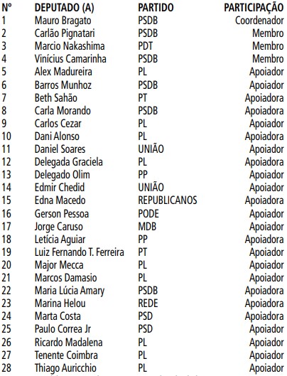 O Presidente da Assembleia Legislativa do Estado de São Paulo, no uso de suas atribuições regimentais e observado a inicial do Processo Alesp Sem Papel N° 8482, Frente Parlamentar N° 24, entregue à Mesa em 24/03/2023, do Deputado Mauro Bragato, bem como os Termos de Adesão, nomeia as Deputadas e os Deputados relacionados abaixo para compor a Frente Parlamentar pela Regularização Fundiária Urbana e Rural do Estado de São Paulo.