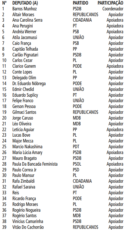 O Presidente da Assembleia Legislativa do Estado de São Paulo, no uso de suas atribuições regimentais e observado a inicial do Processo Alesp Sem Papel N° 9091/2024, Frente Parlamentar N° 10/2024, entregue à Mesa em 11/04/2024, do Deputado Barros Munhoz, bem como os Termos de Adesão, nomeia as Deputadas e os Deputados relacionados abaixo para compor a Frente Parlamentar de Apoio a Construção de um Hospital Regional em Campinas.