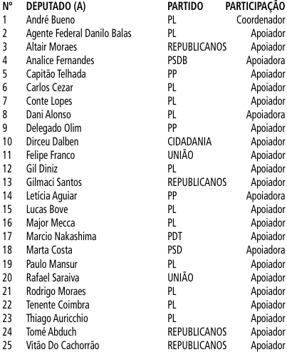 O Presidente da Assembleia Legislativa do Estado de São Paulo, no uso de suas atribuições regimentais e observado a inicial do Processo Alesp Sem Papel N° 11231/2024, Frente Parlamentar N° 13/2024, entregue à Mesa em 03/05/2024, do Deputado André Bueno, bem como os Termos de Adesão, nomeia as Deputadas e os Deputados relacionados abaixo para compor a Frente Parlamentar em Defesa do Movimento Cristão de Conscientização Política.