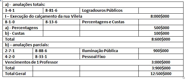 a) - 12:500$000 (doze contos e quinhentos mil réis), pelos recursos provenientes das anulações de que trata o artigo anterior;