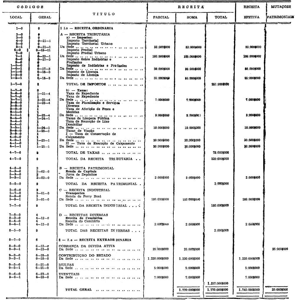 Artigo 1.° - A Receita Geral da Prefeitura Sanitária de GUARUJÁ, para o exercício de 1942, é orçada em 1.770.000$000 - (um mil setecentos e setenta centos de réis), e será arrecadada de conformidade com a legislação em vigor, obedecendo à seguinte classificação: