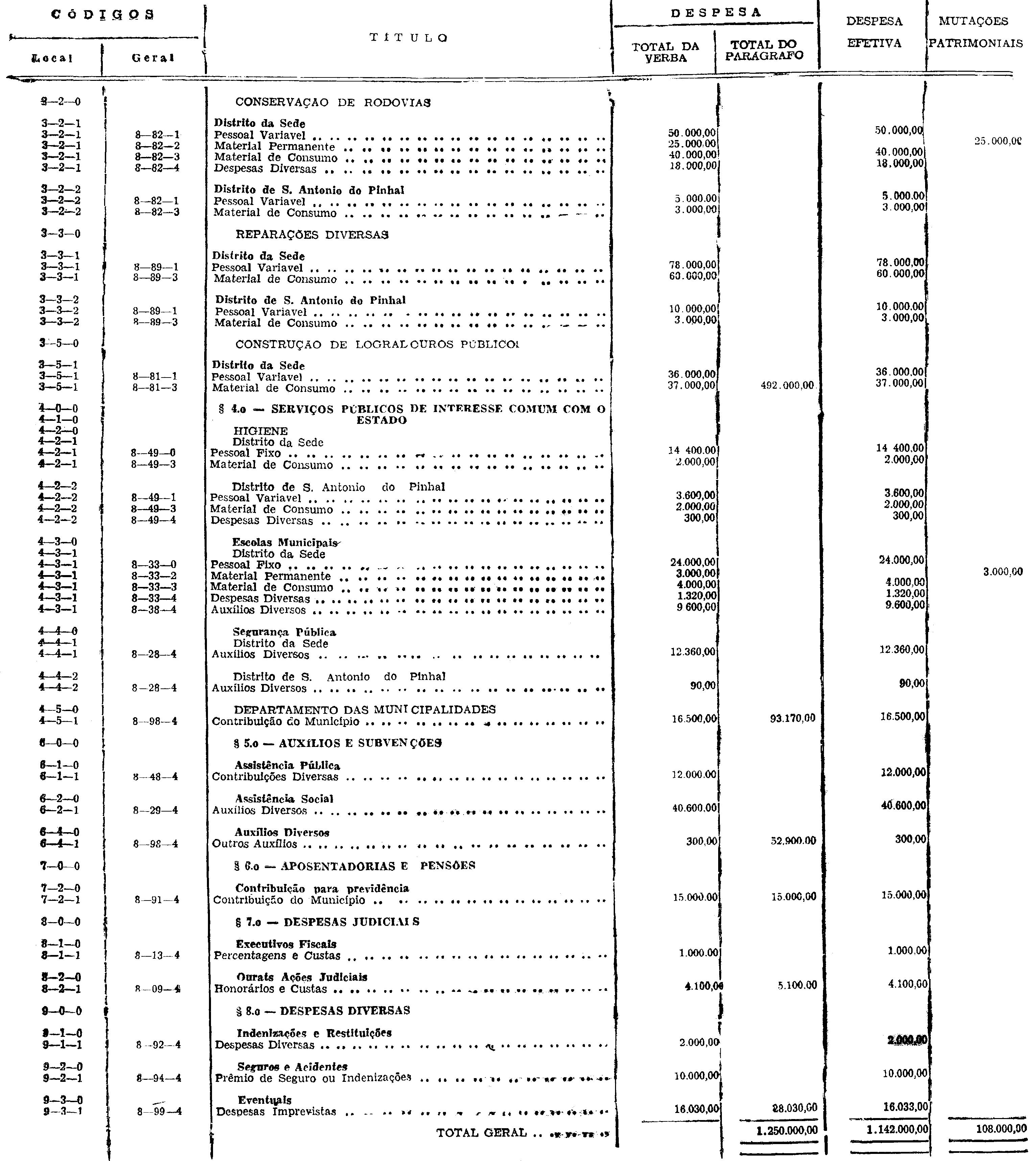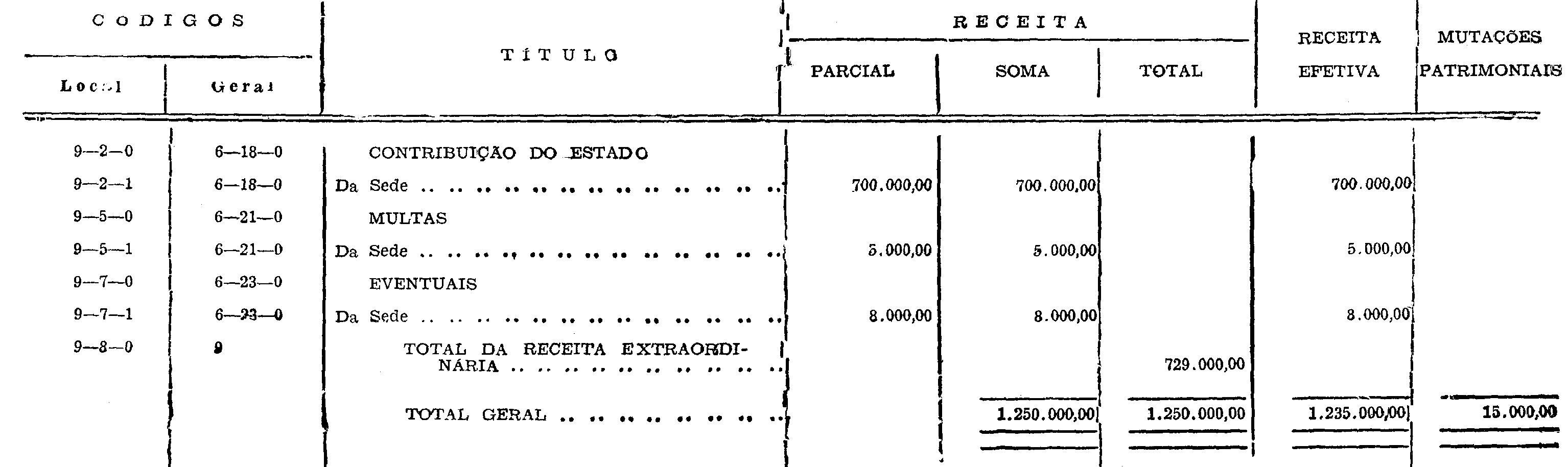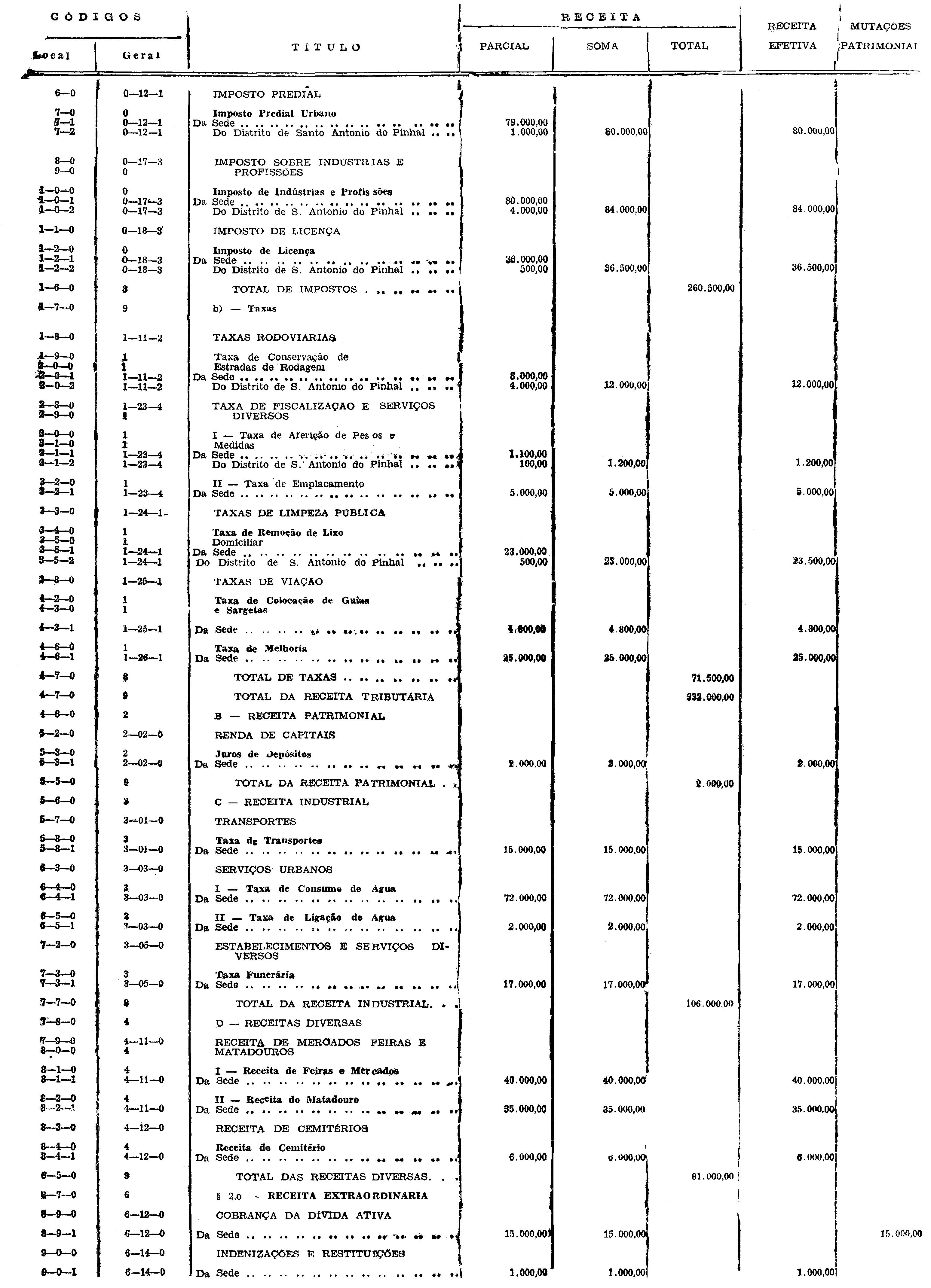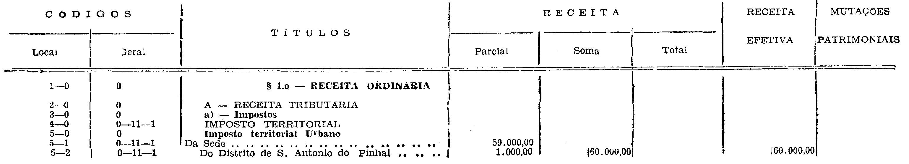 Artigo 1.º - A Recerta Geral do Município de CAMPOS DO JORDÃO, para o exercício de 1944, é orçada em Cr$ 1.250.000,00 (um milhão duzentos e cinquenta mil cruzeiros), e será arrecadada de conformidade com a legislação em vigor, obedecendo a seguinte classificação: