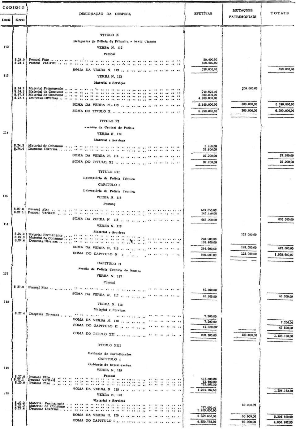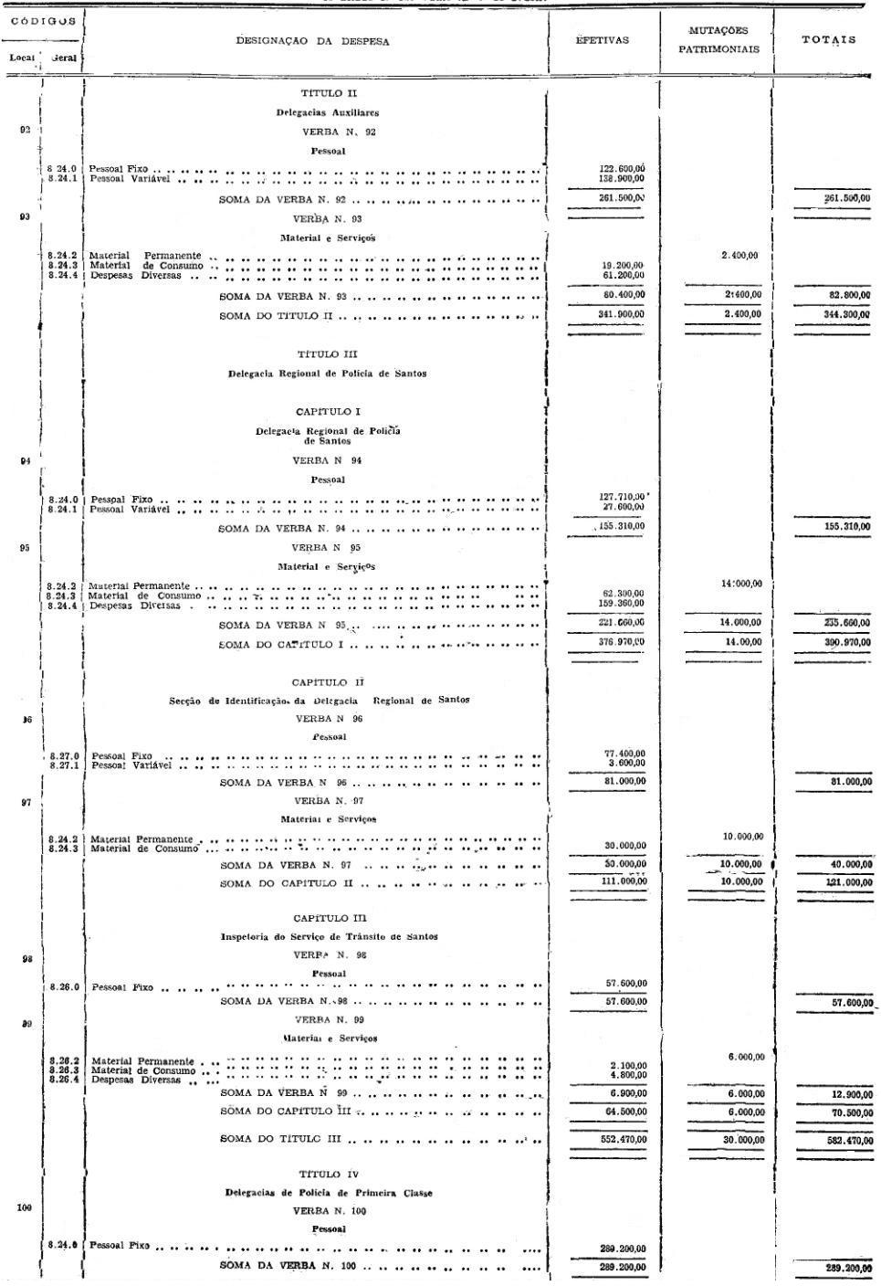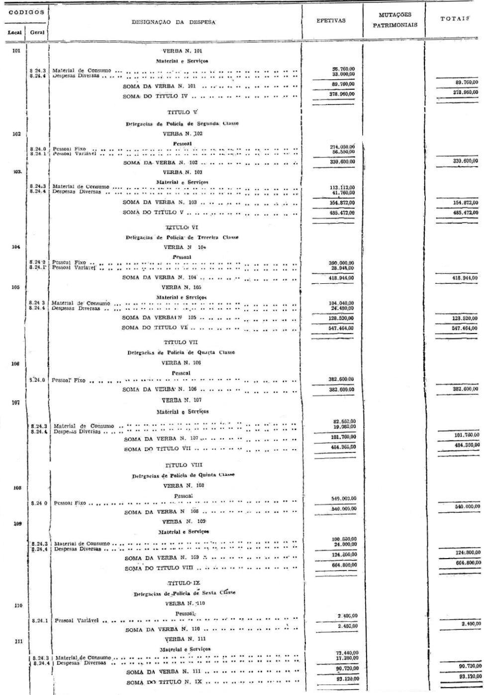 No título X (após a verba 111), leia-se "Delegacias de Polícia de Primeira a sexta Classe".