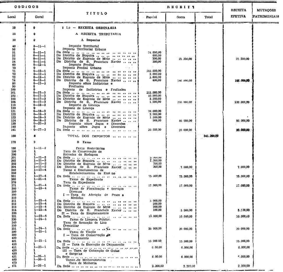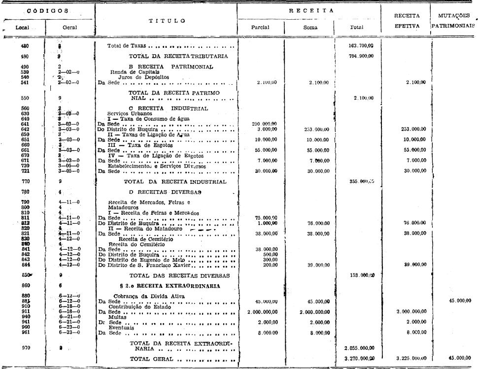 Artigo 1.º - A Receita Geral do Municipio de São José dos Campos, para o exercício de 1945, é orçada em Cr$ 3.270.000,00 (três milhões, duzentos e setenta mil cruzeiros), e será arrecadada de conformidade com a legislação em vigor, obedecendo à seguinte classificação: