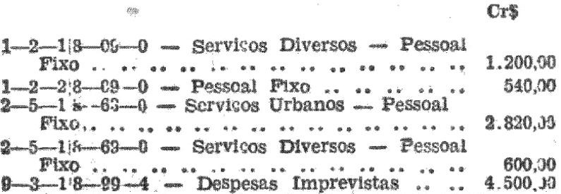 Artigo 1.º - Fica aberto na Contadoria da Prefeitura Sanitária de São José dos Campos, um crédito de Cr$ 9.660,00 (nove mil, seiscentos e sessenta cruzeiros), suplementar às seguintes verbas do orçamento: