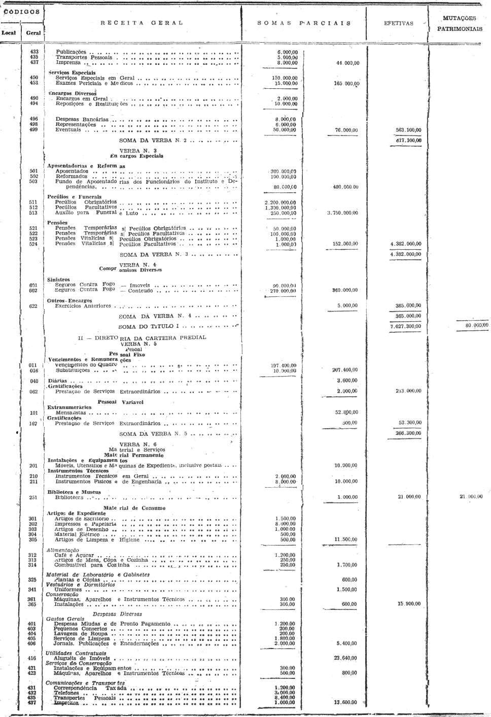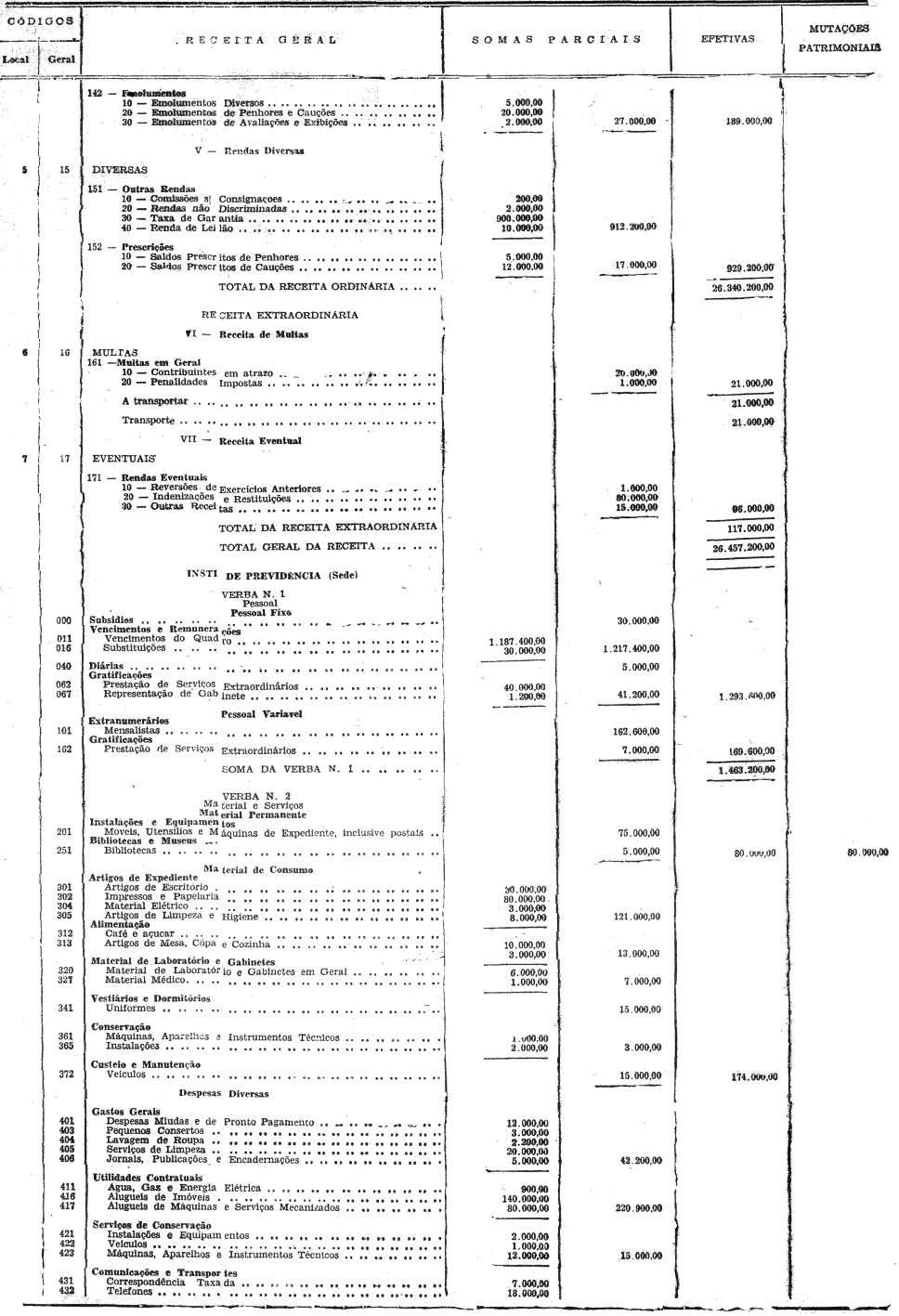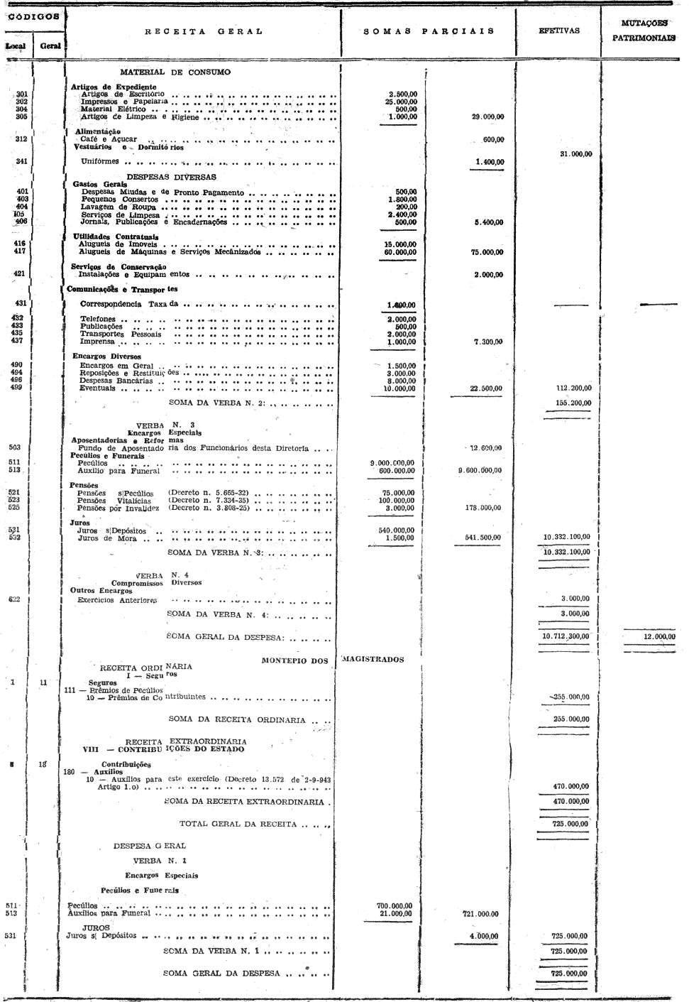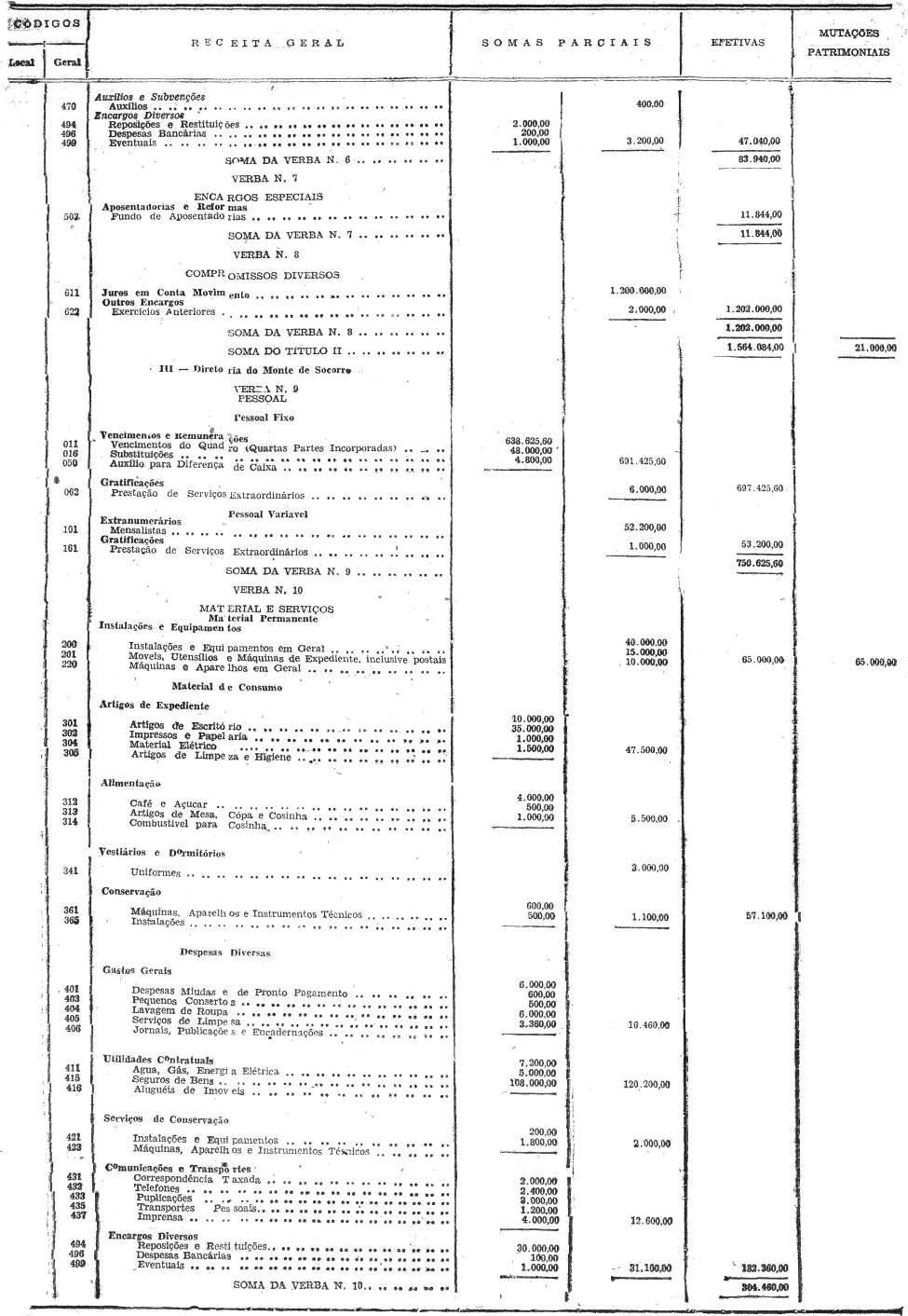 No quadro da Despesa Geral - Verba n. 2 - Despesas Diversas - Gastos Gerais, onde se lê:... "Código Local 401 - Despesas Miudas e de Pronto Pagamento .... Cr$ 500,00" e "Código Local 403 - Pequenos Consertos .. Cr$ 1.800,00", leia-se: ..."Codigo Local 401 - Despesas Miudas de Pronto Pagamento - Cr$ 1.800,00" e "Código Local 403 - Pequenos Consertos - ... Cr$ 500,00".