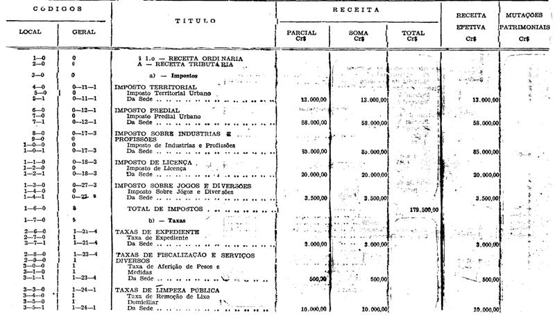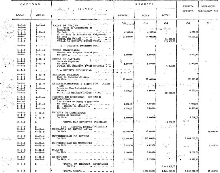 Artigo 1.º - A Receita Geral da Prefeitura Sanitária de SERRA NEGRA, para o exercício de 1946, e orçada em Cr$ 1.355.000,00 (um milhao trezentos e cinquenta e cinco mil cruzeiros), e será arrecadada de conformidade com a legislação em vigor, obedecendo a seguinte classificação: