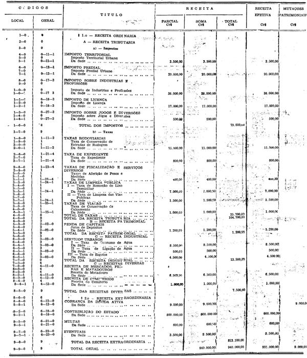 Artigo 1.º - A Receita Geral da Prefeitura Sanitária de Aguas da Prata, para o exercicio de 1946, e orçada em Cr$ 940.000,00 (novecentos e quarenta mil cruzeiros), e será arrecada de conformidade com a legislação em vigor, obedecendo a seguinte classificação: