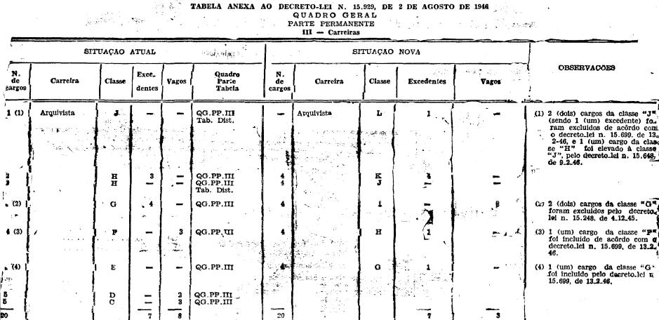 Leia-se "(4) 1 (um) cargo da classe "E" foi incluido pelo decreto-lei n. 15.699, de 12-2-46.