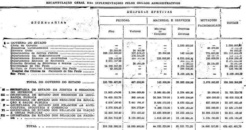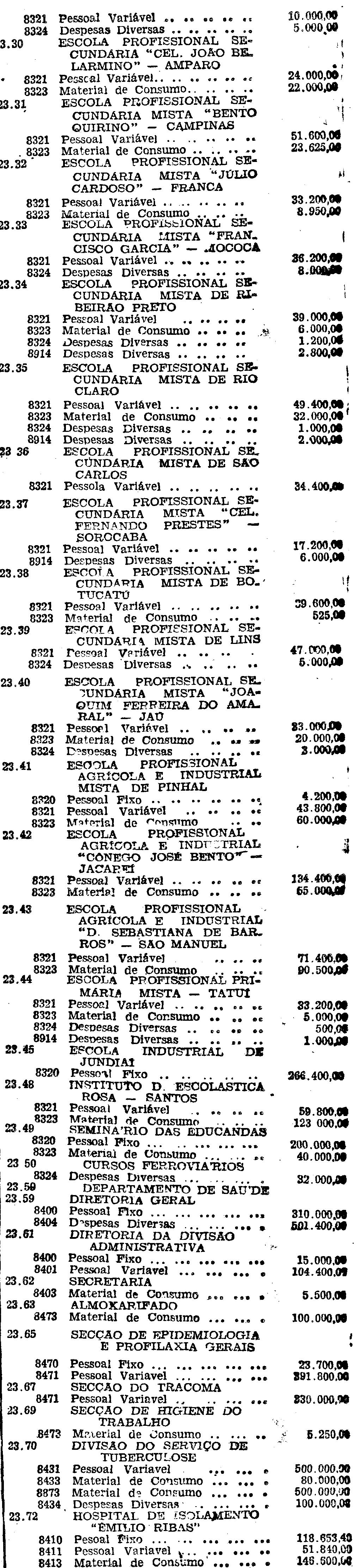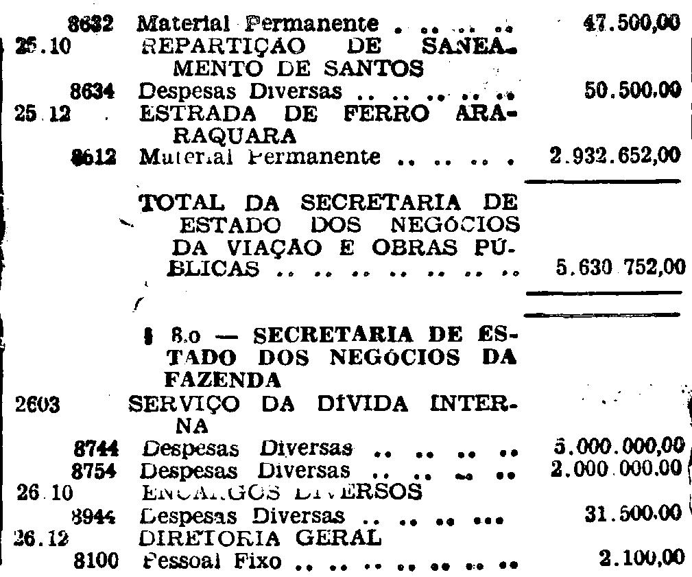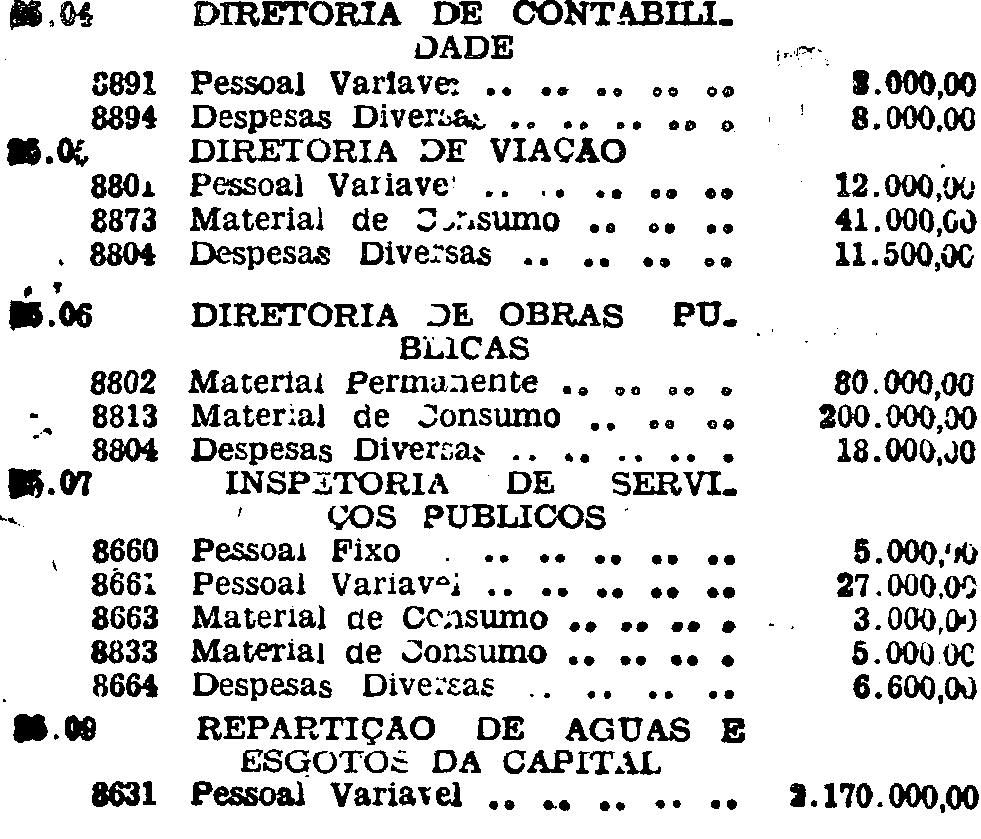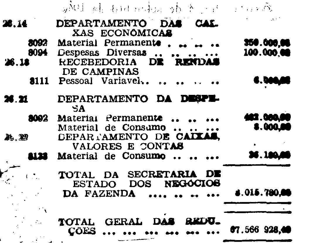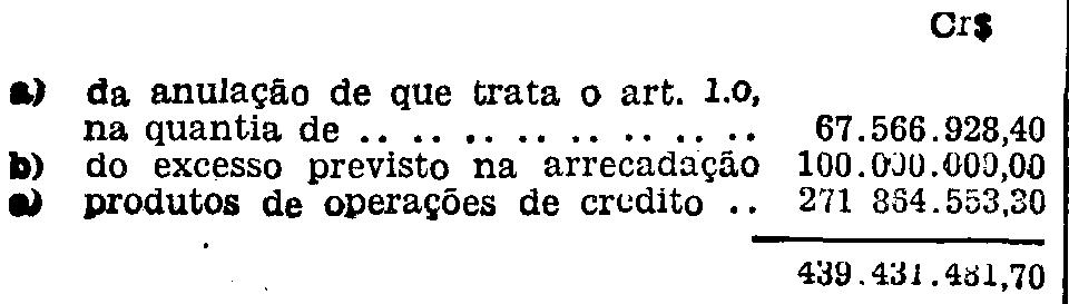 Artigo 2.º - Ficam suplementadas dotações no orçamento vigênte, na importância total de Cr$ 439.431.481,70 (quatrocentos e trinta e nove milhões, quatrocentos e trinta e um mil, quatrocentos e oitenta e um cruzeiros e setenta centavos), como abaixo se discrimina.