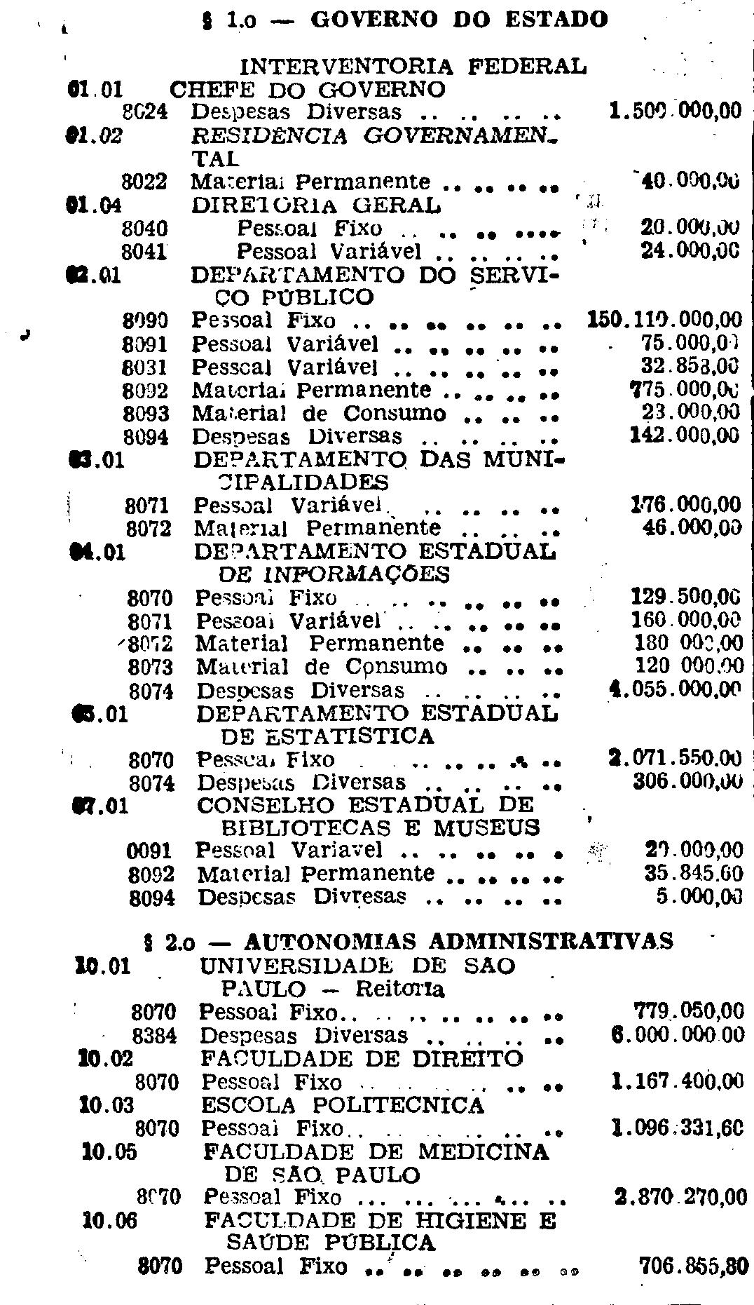 Artigo 1.º - Ficam anuladas na importância de Cr$ 67.566.928,40 (sessenta e sete milhões, quinhentos e sessenta e seis mil, novecentos e vinte e oito cruzeiros e quarenta centavos), as seguintes dotações do orçamento vigente do Estado, conforme discriminação abaixo: