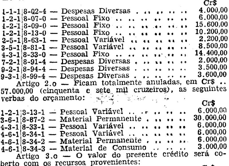 crédito suplementar de Cr$ 70.000,00, na Prefeitura da