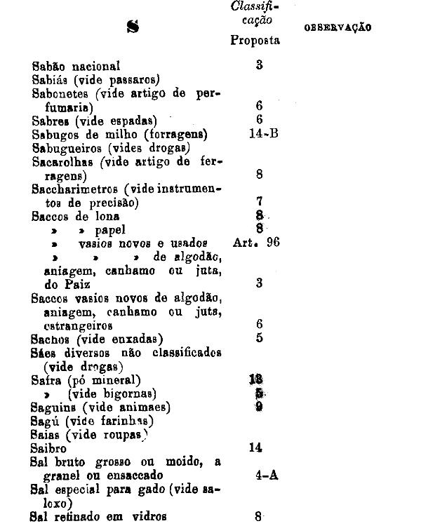 agricultura, sal ordinario e os demais productos classificados nesta tabella