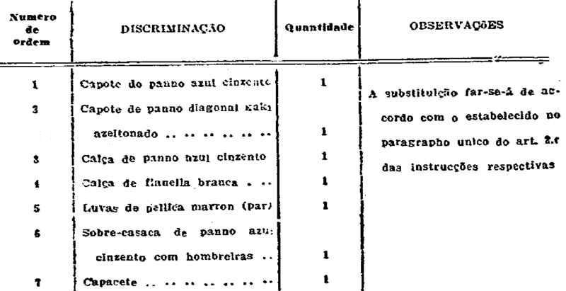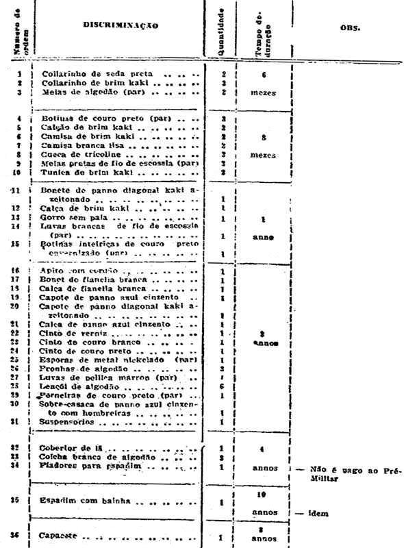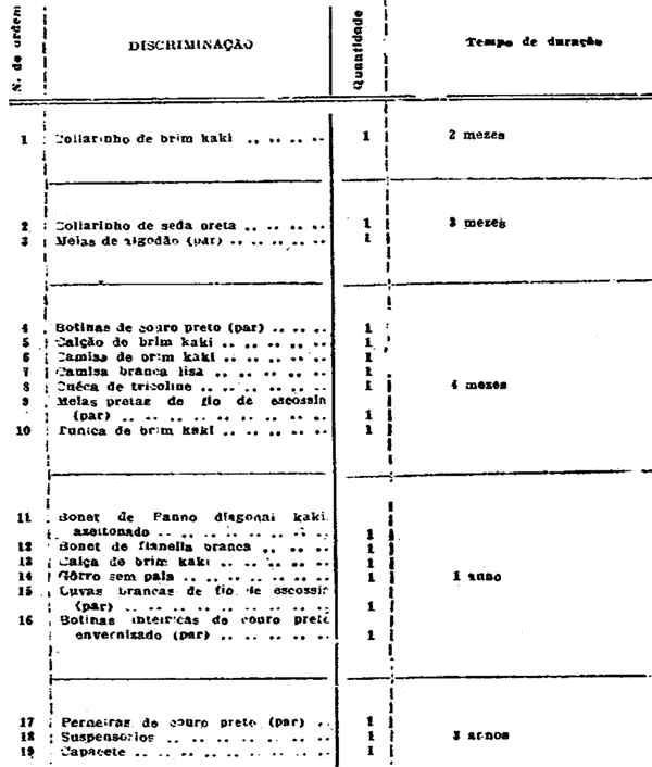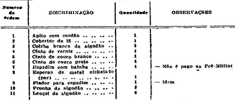 Fardamento e artigos com duração limitada a ser distribuido aos alumnos dos Cursos Pré-Militar, C. O. C. e C. O. A. do C. I. M. após o vencimento (art. 4.º)
