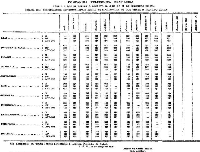 interurbano da Companhia Telefônica Brasileira, entre as localidades a que se
