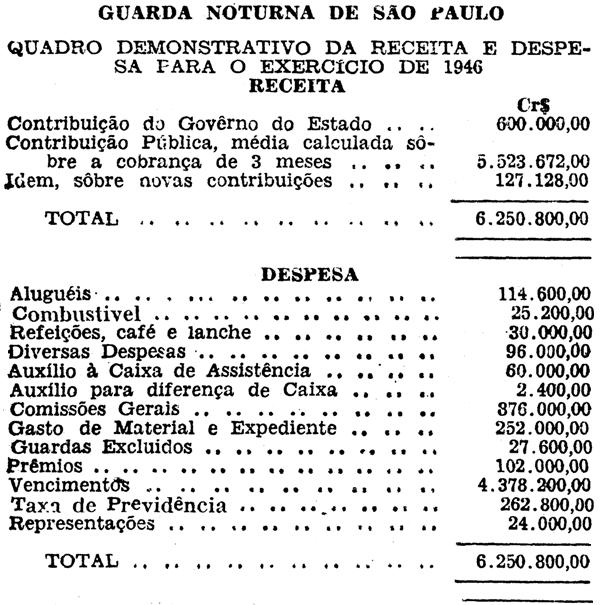 orçamento da receita e despesa da Guarda Noturna de São Paulo, para o