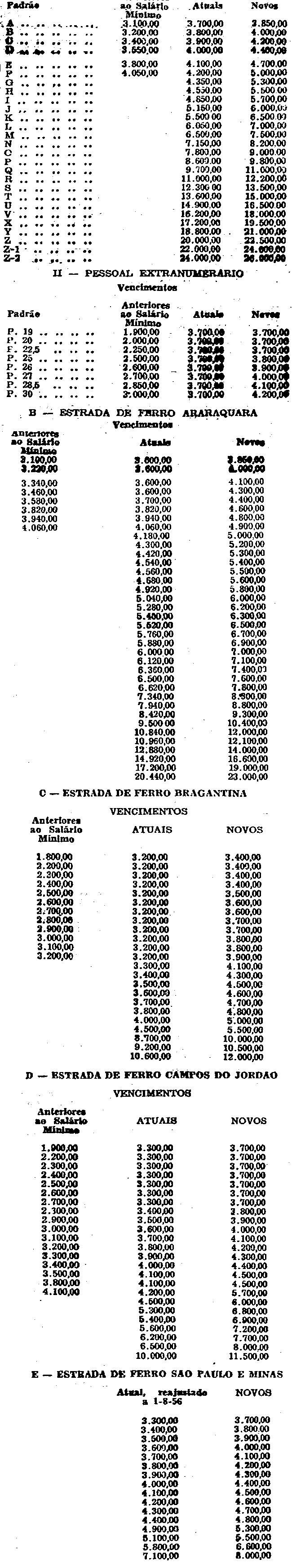 JÂNIO QUADROS, GOVERNADOR DO ESTADO DE SÃO PAULO, usando das atribuições legais, Artigo 1.º - A escala padrão de vencimentos das Estradas de Ferro de propriedade do Estado passa a ter os seguintes valores: