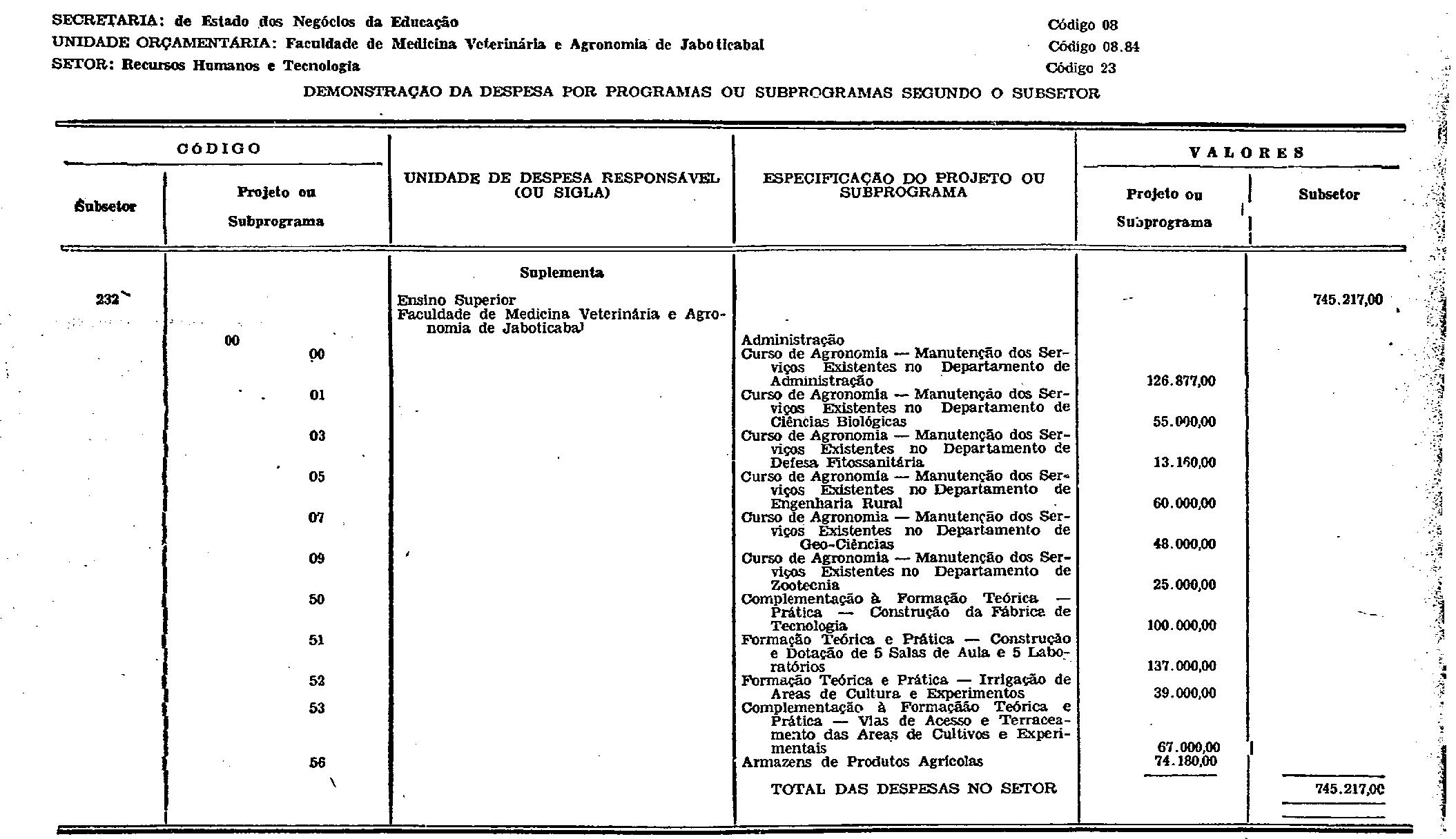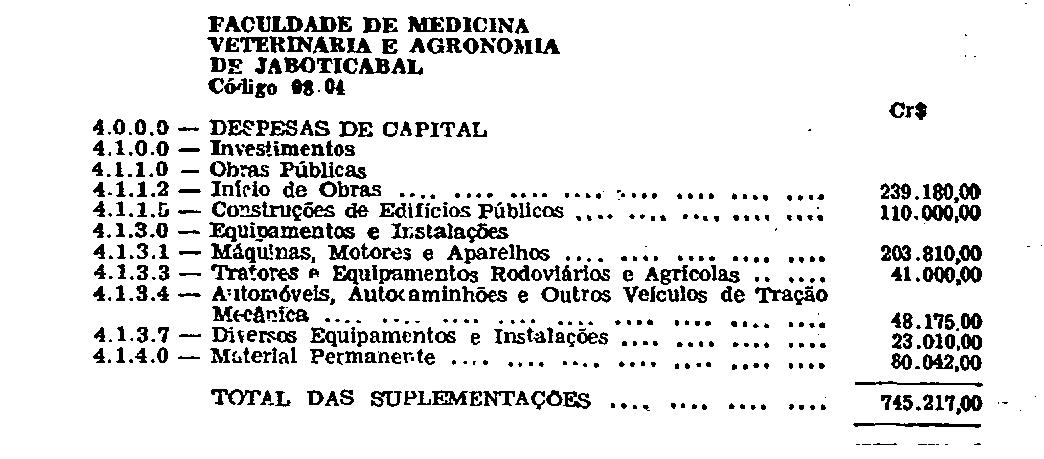 Artigo 1.º - Fica aberto na Faculdade de Medicina Veterinária e Agronomia de Jaboticabal, um crédito de Cr$ 745.217,00 (setecentos e quarenta e cinco mil, duzendo e dezessete cruzeiros), suplementar às dotações do seu orçamento vigente, abaixo discriminadas: