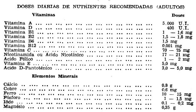 A suplementação do alimento com vitaminas e/ou sais minerais obedecerá o critério da correlação entre o consumo médio diário recomendado d eum certo alimento e a necessidade diária recomendada dêsses nutrientes. Para as vitaminas e sais minerais adota-se para adultos em estado físico normal, as tabelas anexas.