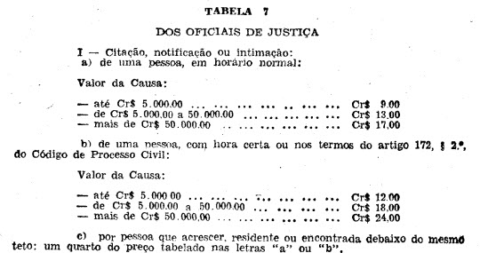 2ª - Nos feitos de valor inestimável (v. Tabela I Nota genérica 3ª) a diligência será cobrada: se for contencioso, como se tivesse o valor de Cr$... 10.000,00; se não for contencioso, como se tivesse o valor de Cr$ 5.000,00.