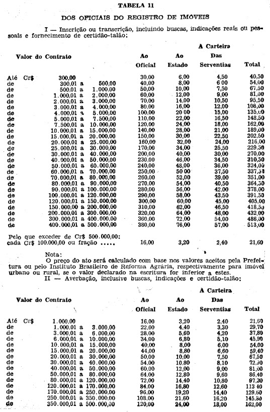 1ª - O preço da averbação será calculado com base nos valores tributários aceitos pela Prefeitura ou pelo Instituto Brasileiro de Reforma Agrária, respectivamente para imóvel urbano ou rural, se o valor declarado pelo interessado for inferior a estes.