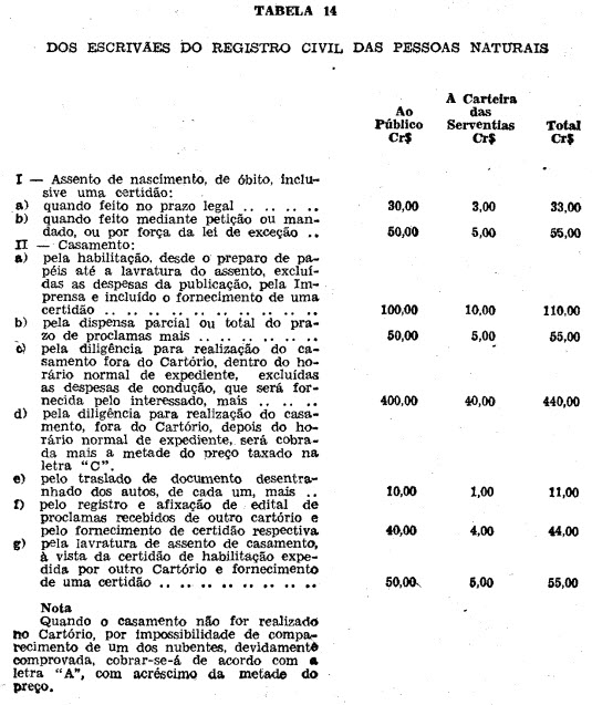 1ª - Os preços acima se referem à certidão por pessoa, não havendo qualquer acréscimo se for solicitada a menção do seu nome por extenso e abreviado, de solteira e de casada, bem como de espólio ou massa falida correspondente à mesma pessoa.