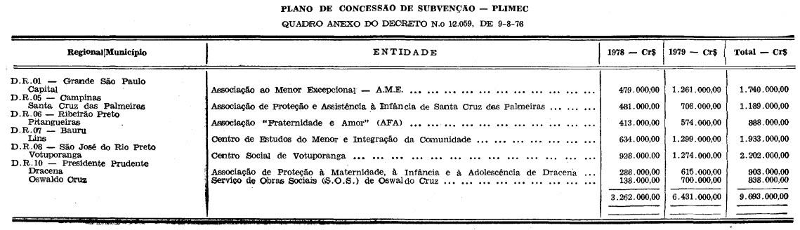 Artigo 2.º - Às instituições assistenciais incluídas no "Plano de Concessão" de que trata o artigo anterior, ficam no exercício de 1978, subvenções na importância de Cr$ 3.262.000,00 (três milhões duzentos e sessenta e dois mil cruzeiros) correndo a despesa à conta do Código 11.04.01 - Categoria Economica 3.0.0.0 - Elemento 3.2.1.0 - do Conselho Estadual de Auxílios e Subveções.