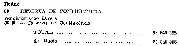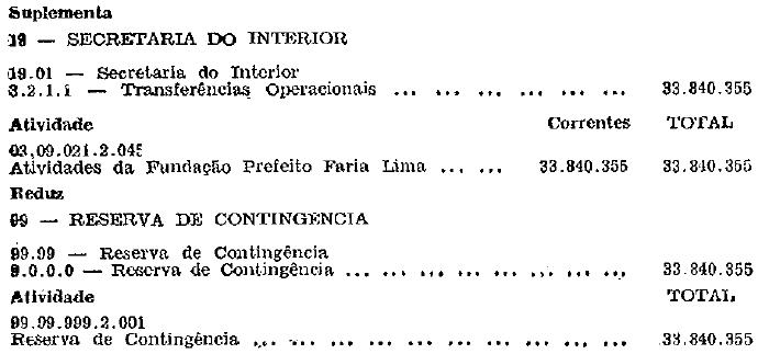 Artigo 1.º - De conformidade com o que dispõe o Artigo 7.°, inciso I, da Lei n. 1.877, de 8 de dezembro de 1978, fica aberto à Secretaria do Interior.um crédito suplementar no valor de cr$ 33.840.355,00 (trinta e tres milhões, oitocentos e quarenta mil, trezentos e cinquenta e cinco cruzeiros), com recusos provenientes da redução parcial de dotação orçamentária consignada à reserva de contingência observando-se na classsificação econômica e funcional-programática, a seguinte discriminação: